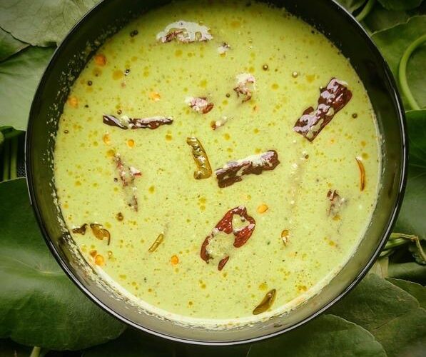 It is a lip smacking and finger licking preparation made with freshly grated coconut , peppercorns, Cumin, slightly toasted leaves and salt. This is completed with addition of buttermilk and seasoned with mustard seeds, hing, dry chili and curry leaves in coconut oil.